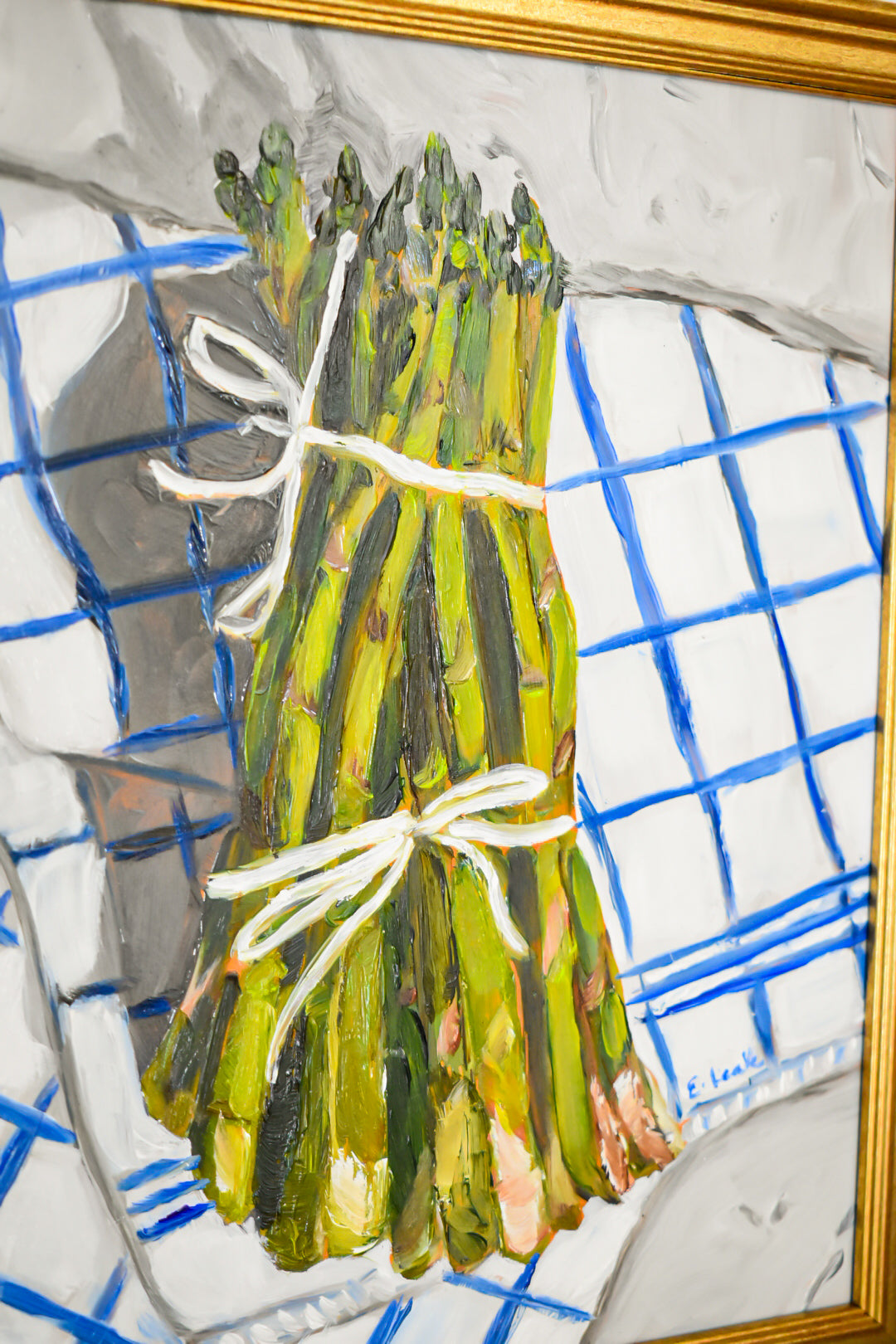 A bundle of asparagus tied with white cord rests atop a blue-and-white windowpane cloth. This 8x10 oil painting framed in gold captures freshness, texture, and subtle elegance — perfect for kitchens or dining rooms.